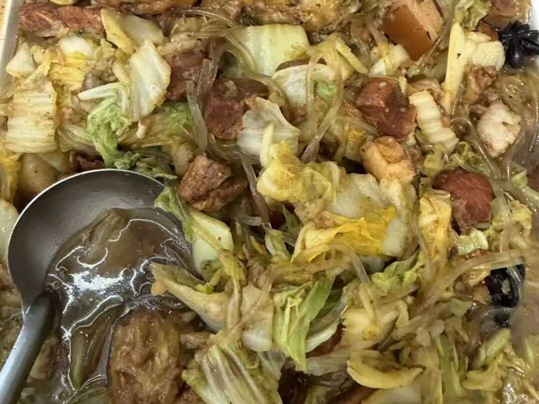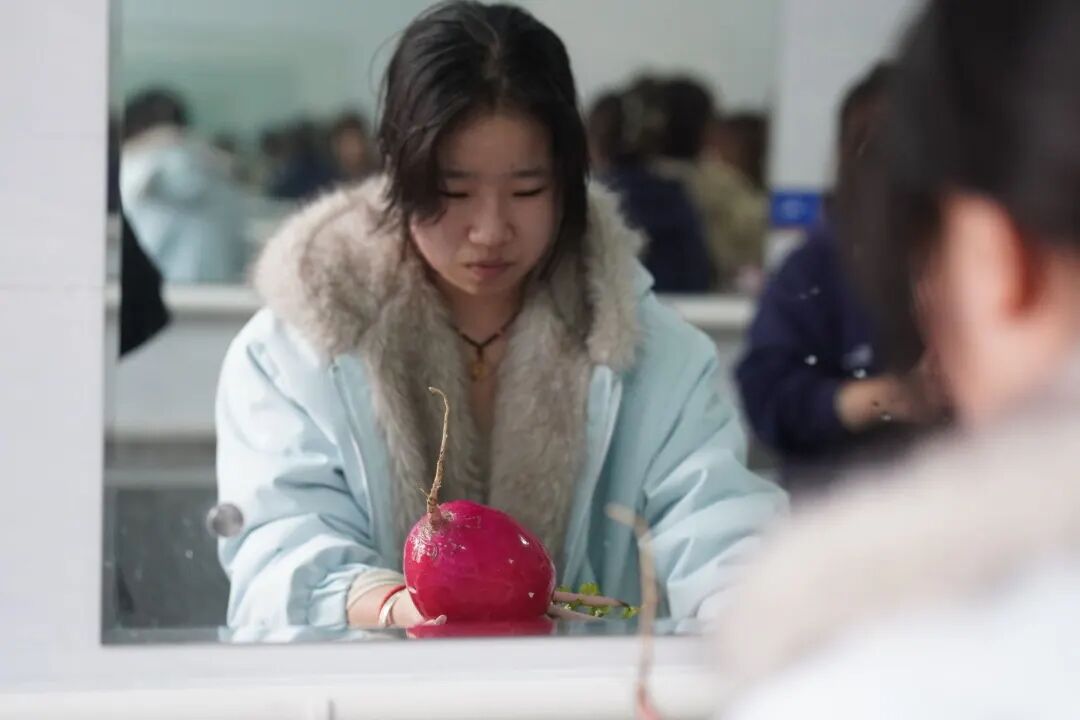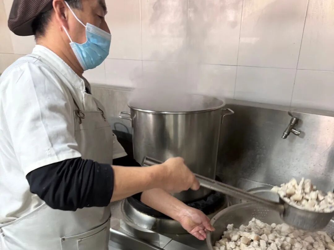 随后,这些新鲜食材被送入社区食堂后厨,师傅们手法娴熟,用同学采摘的蔬菜烹饪出一道道菜品。炖肉烩白菜粉条、红烧萝卜浓郁诱人,清炖萝卜汤热气氤氲,每一道菜都承载着劳动的诚意。