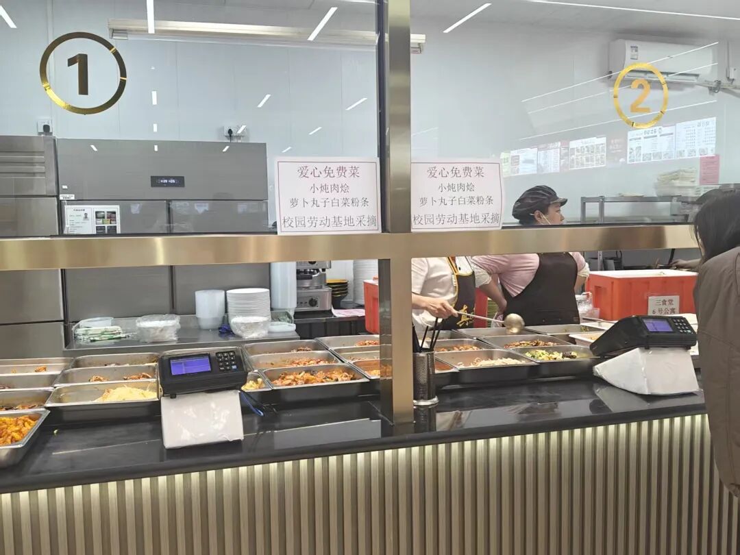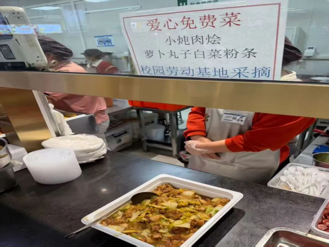 傍晚时分,在第三食堂免费爱心菜品窗口前已排起长队。食堂阿姨为师生一一打菜,接过餐盘的同学细细品味,同学们吃上了自己采摘的爱心餐。
